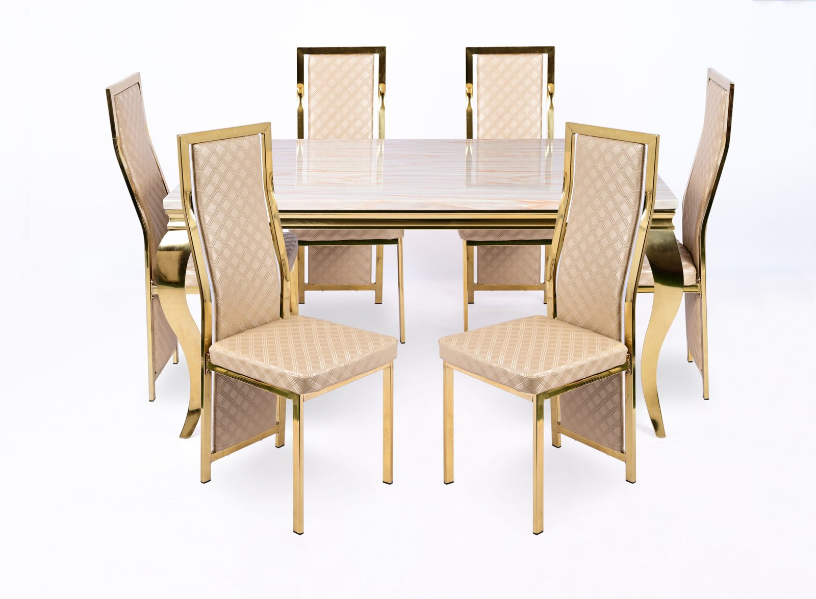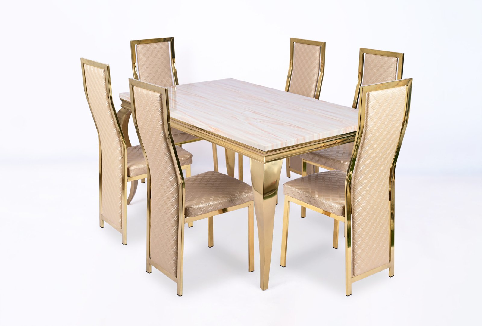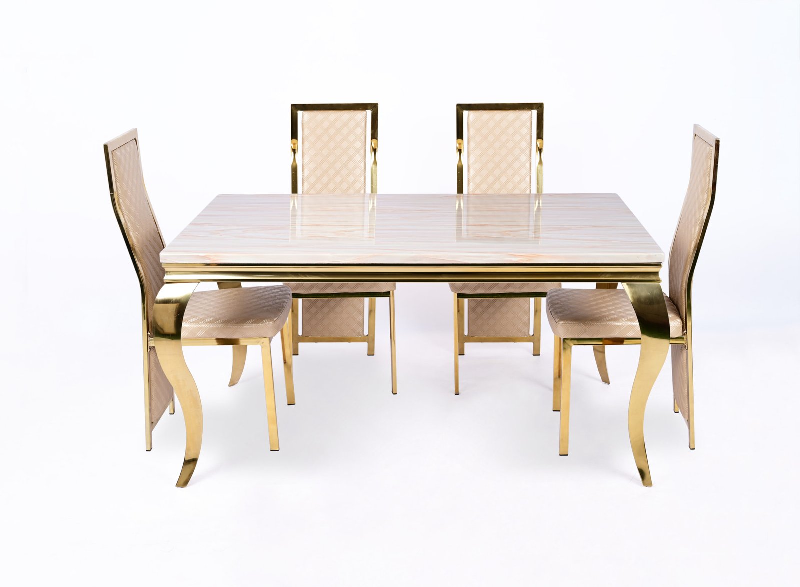 Desain Kaki Lengkung Estetik: Kaki meja dengan desain curvy berwarna emas memberikan sentuhan gaya klasik yang tetap relevan dengan interior modern.