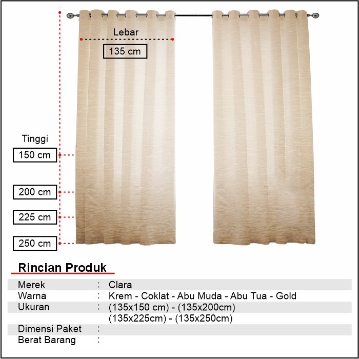 Pilihan Tinggi Gorden: Tersedia dalam ukuran 150 cm, 200 cm, 225 cm, dan 250 cm.