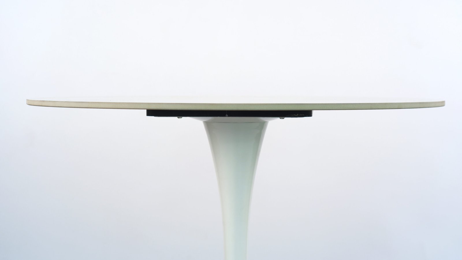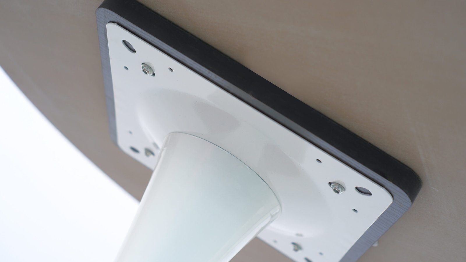 Desain Ikonik & Minimalis: Menggunakan kaki model satu kolom (pedestal) yang memberikan ruang kaki lebih leluasa tanpa terhambat tiang meja.