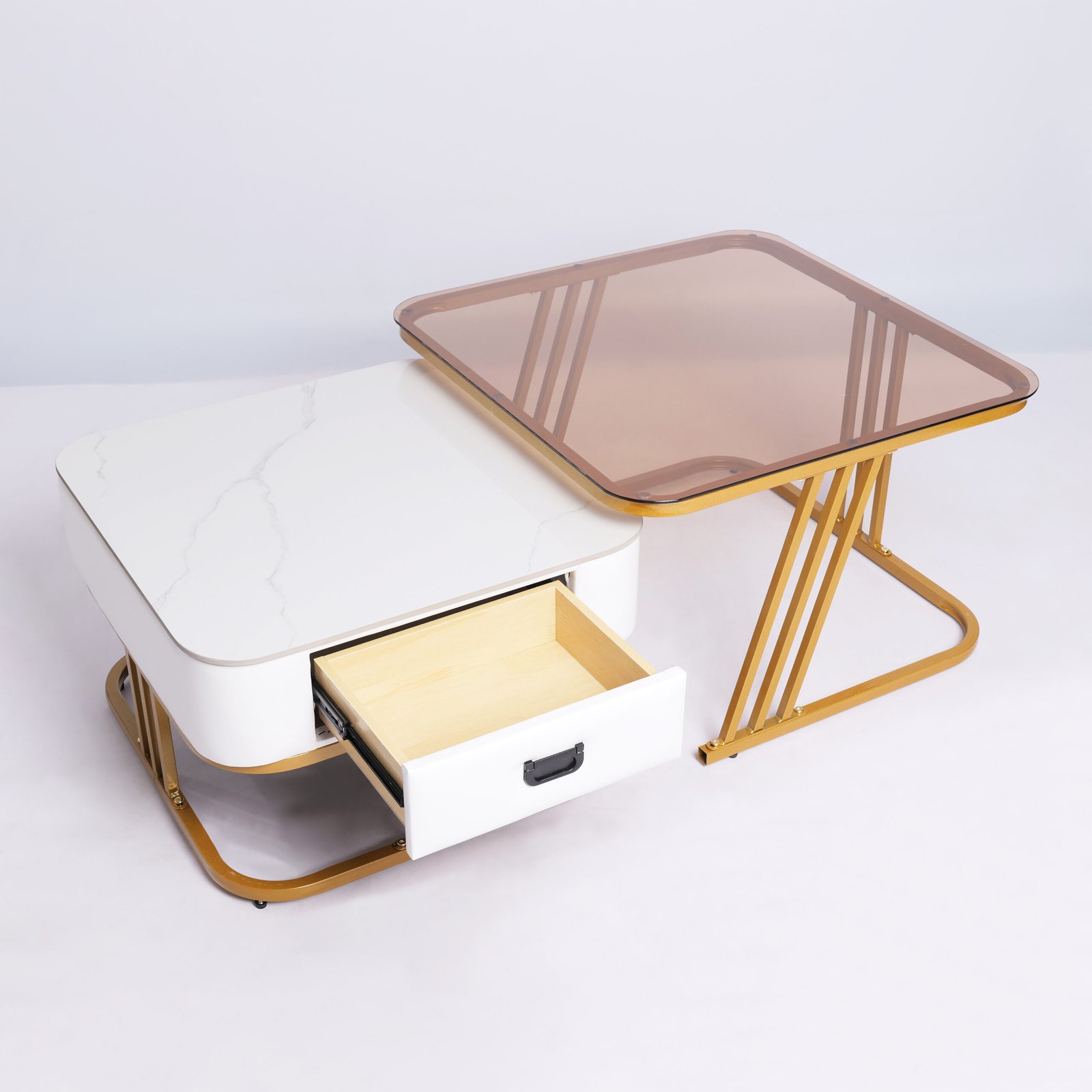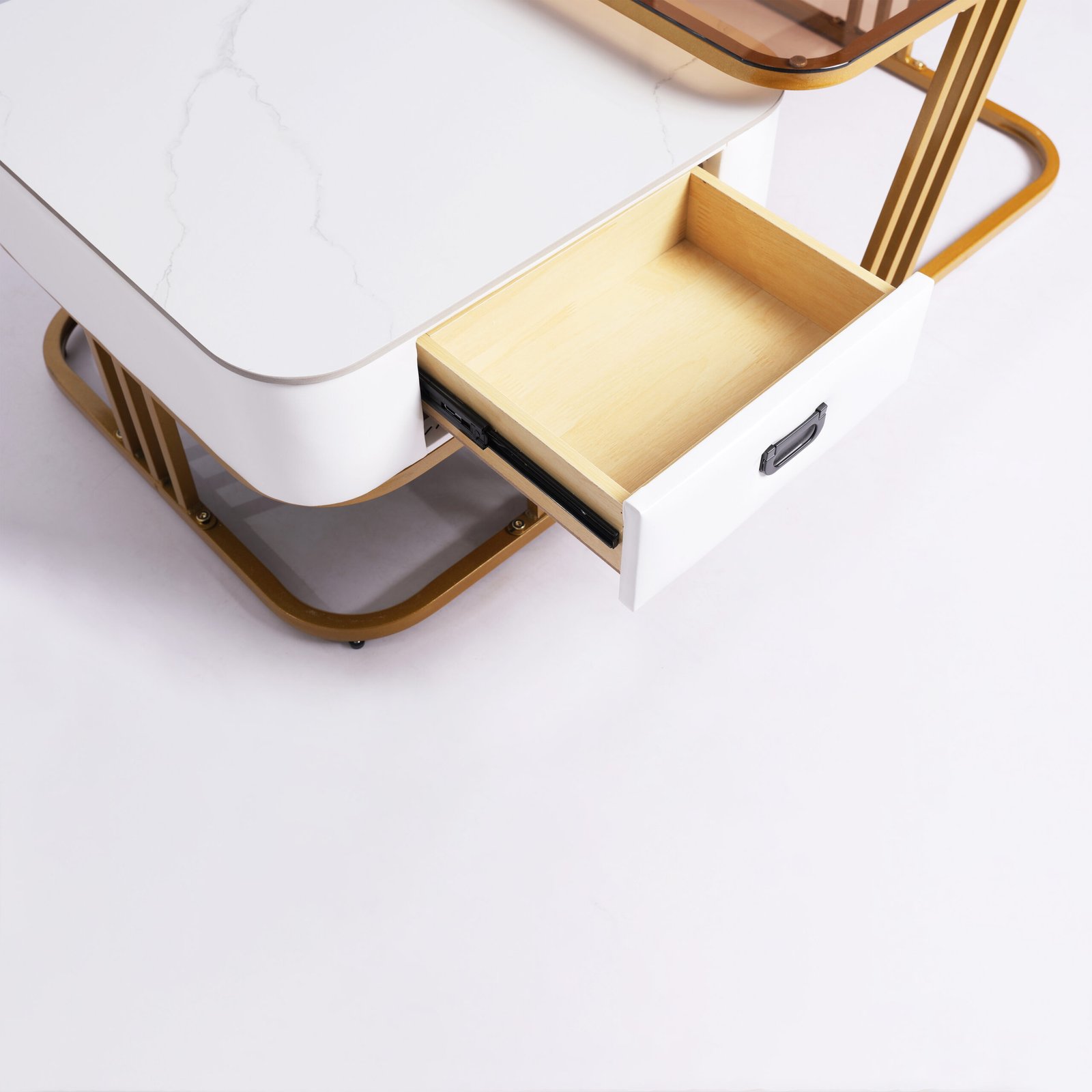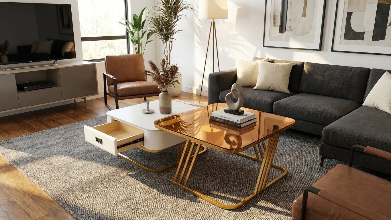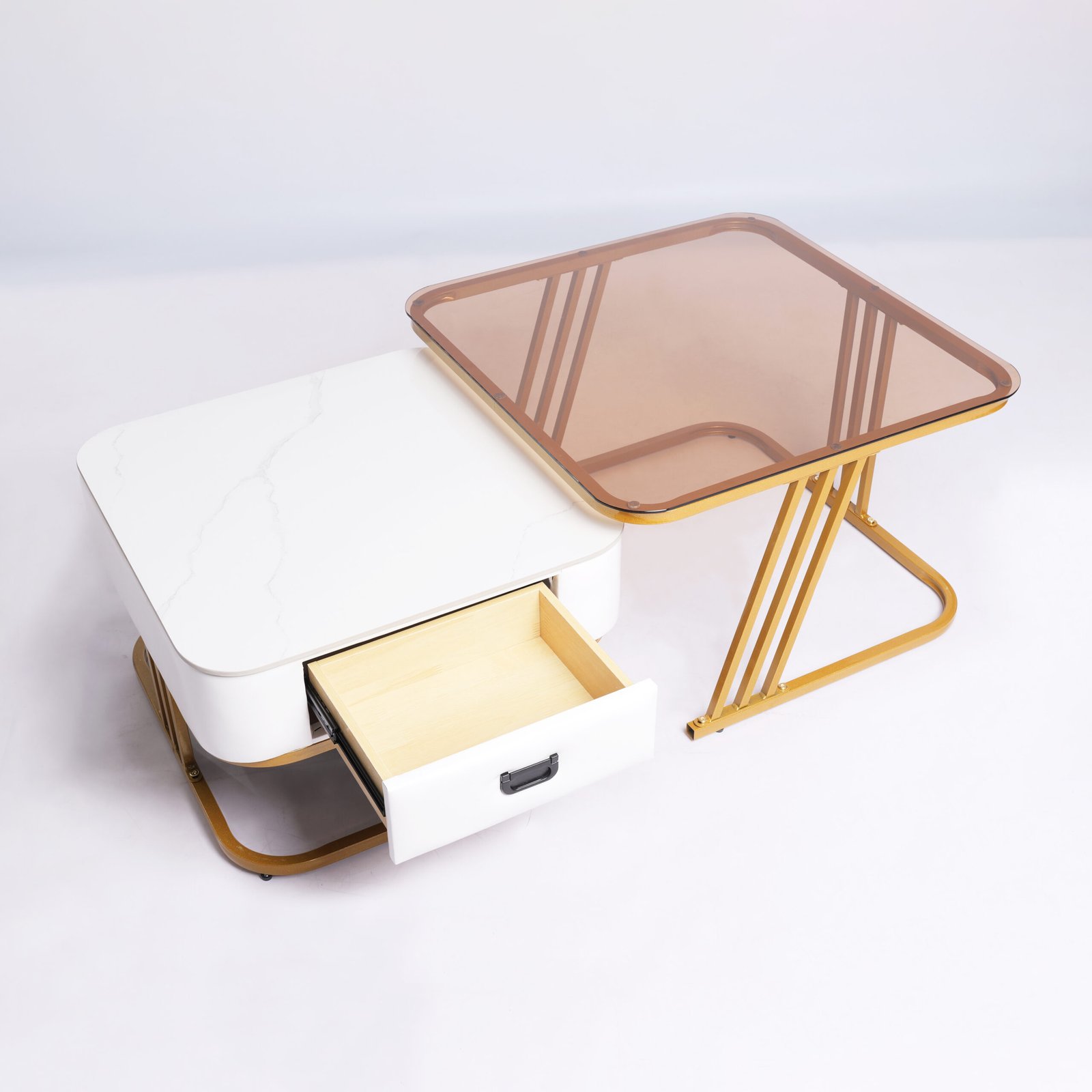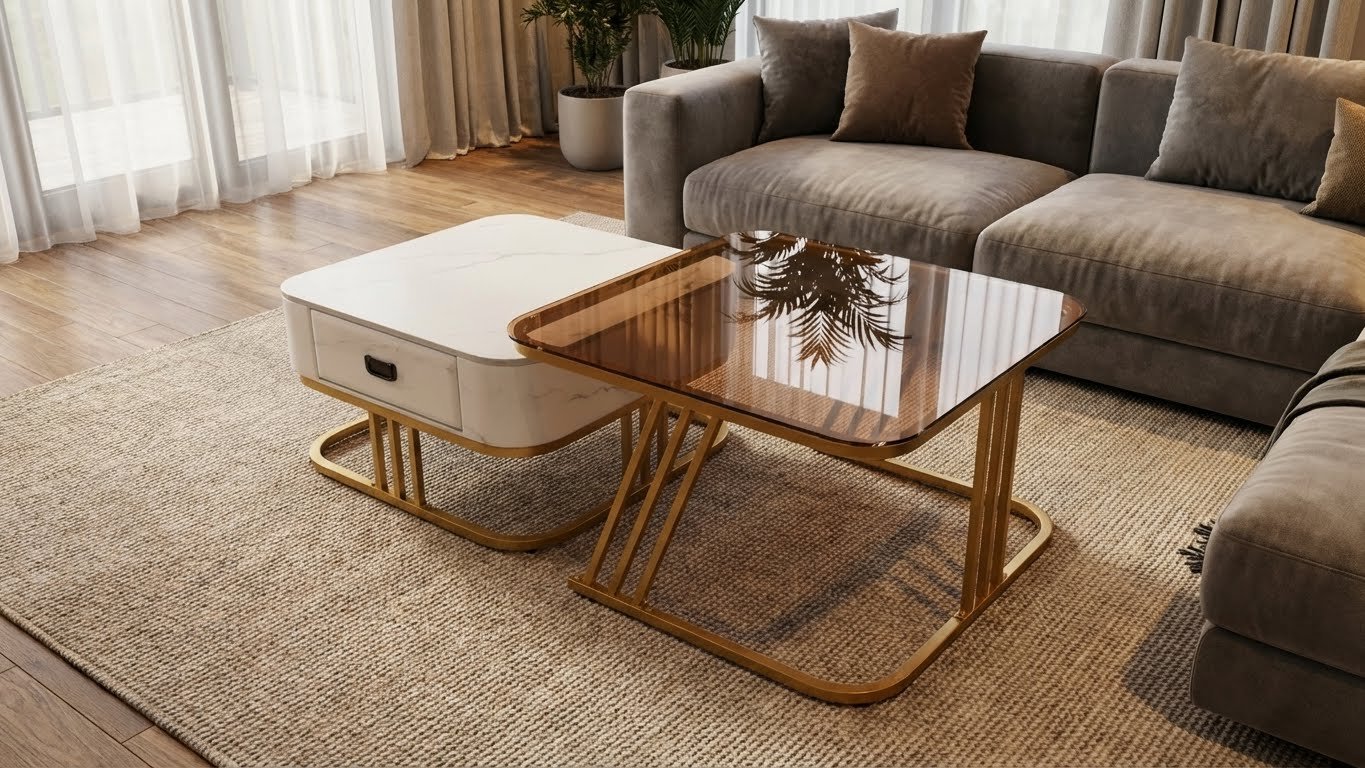 Fitur Nesting Cerdas: Meja laci dapat disimpan di bawah meja kaca untuk menghemat ruang, atau ditarik keluar untuk menciptakan area permukaan yang lebih luas saat menjamu tamu.