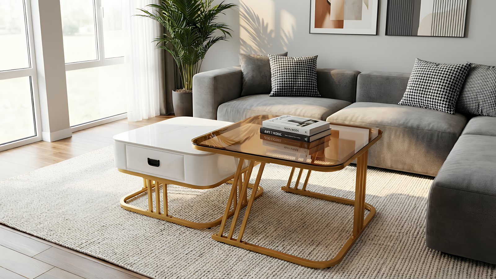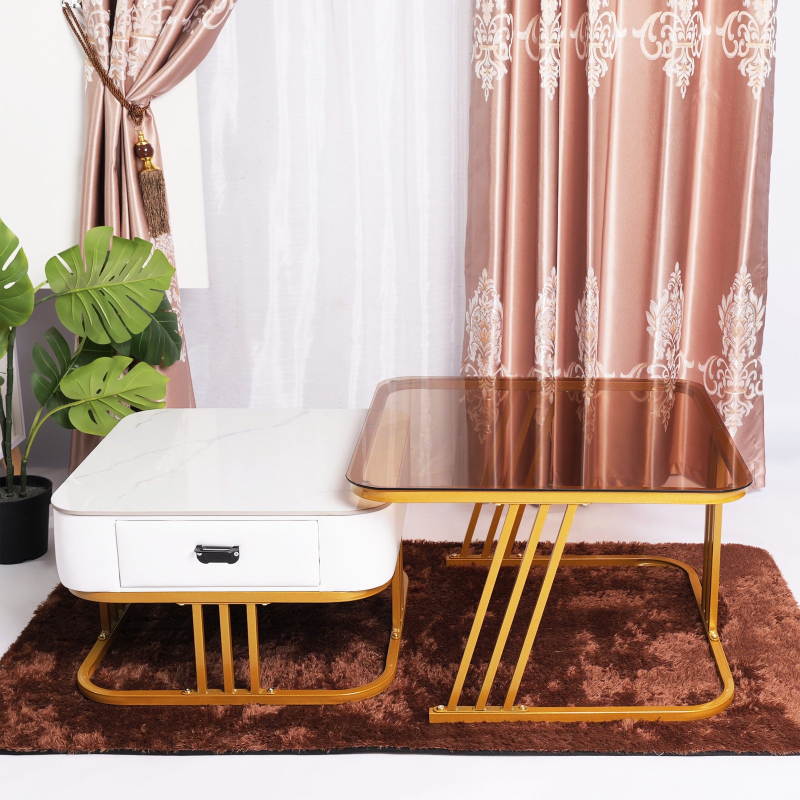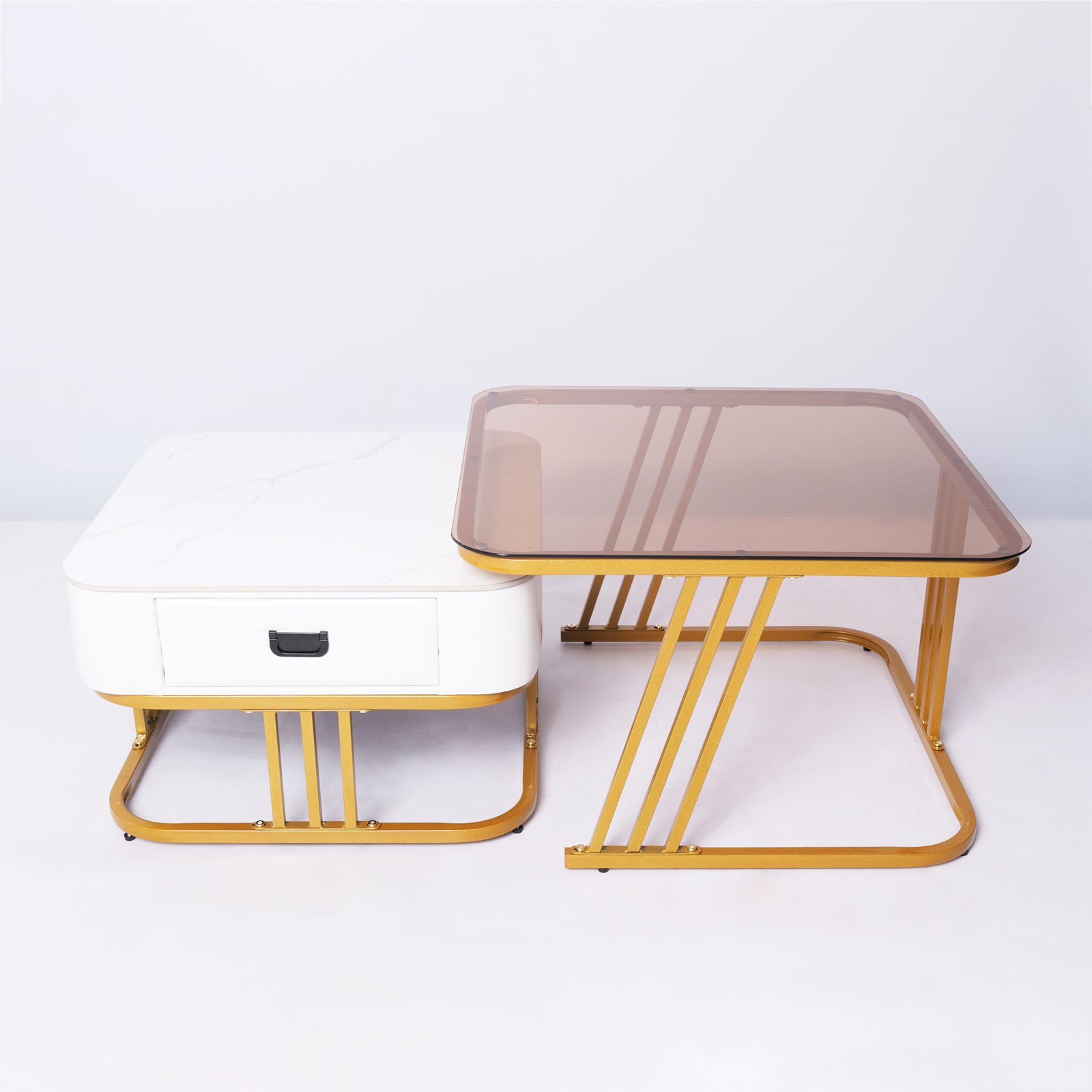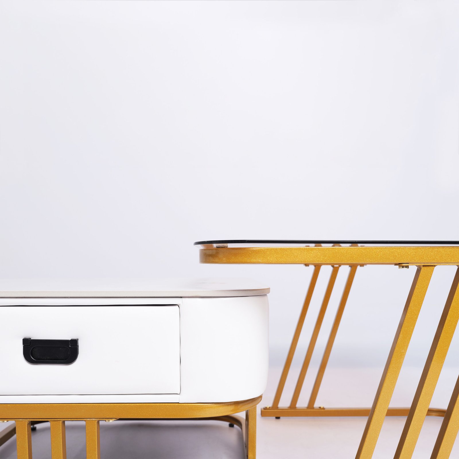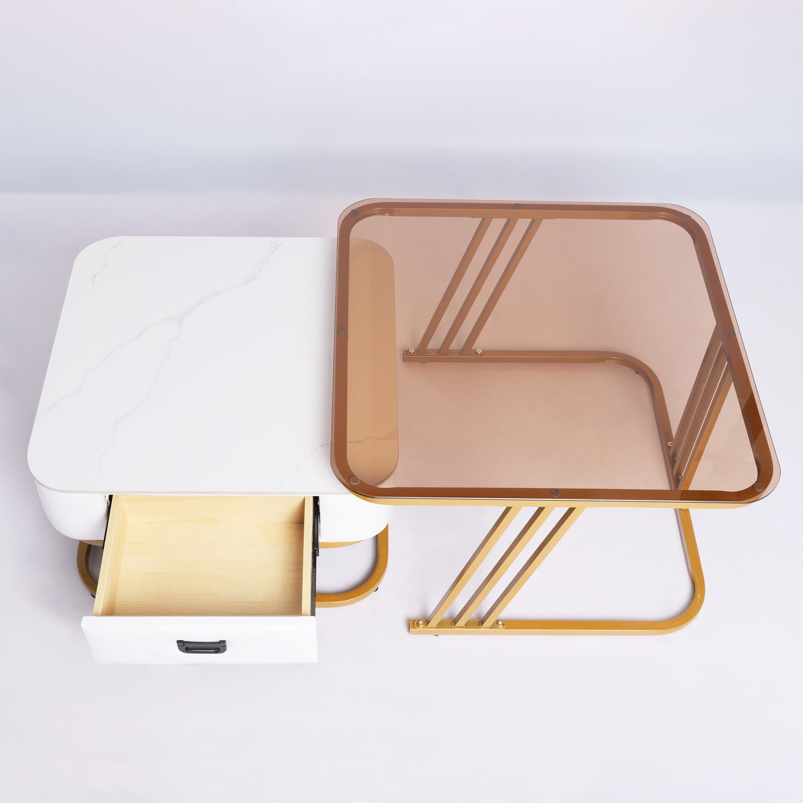 Fitur Nesting Cerdas: Meja laci dapat disimpan di bawah meja kaca untuk menghemat ruang, atau ditarik keluar untuk menciptakan area permukaan yang lebih luas saat menjamu tamu.
