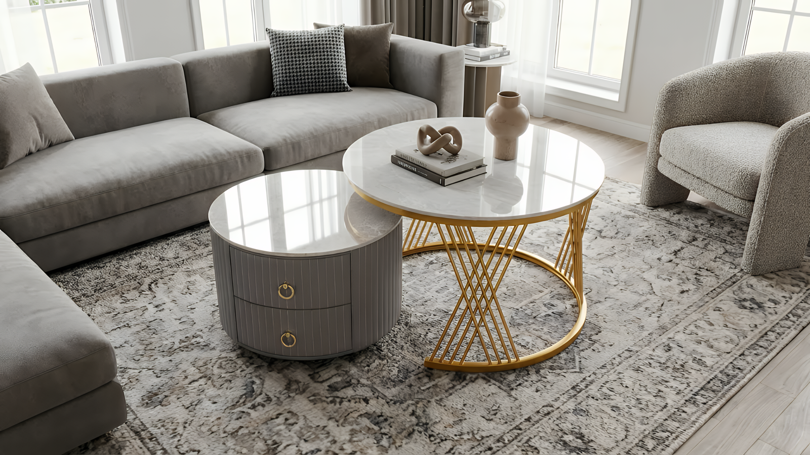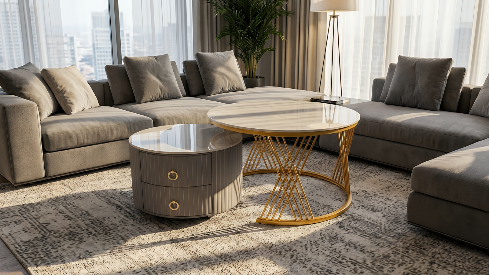 Saran Penggunaan: Sangat cocok dipadukan dengan sofa minimalis berwarna netral atau karpet bermotif untuk menonjolkan aksen emas pada meja.