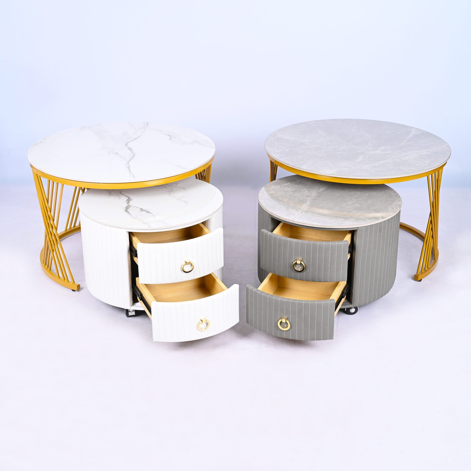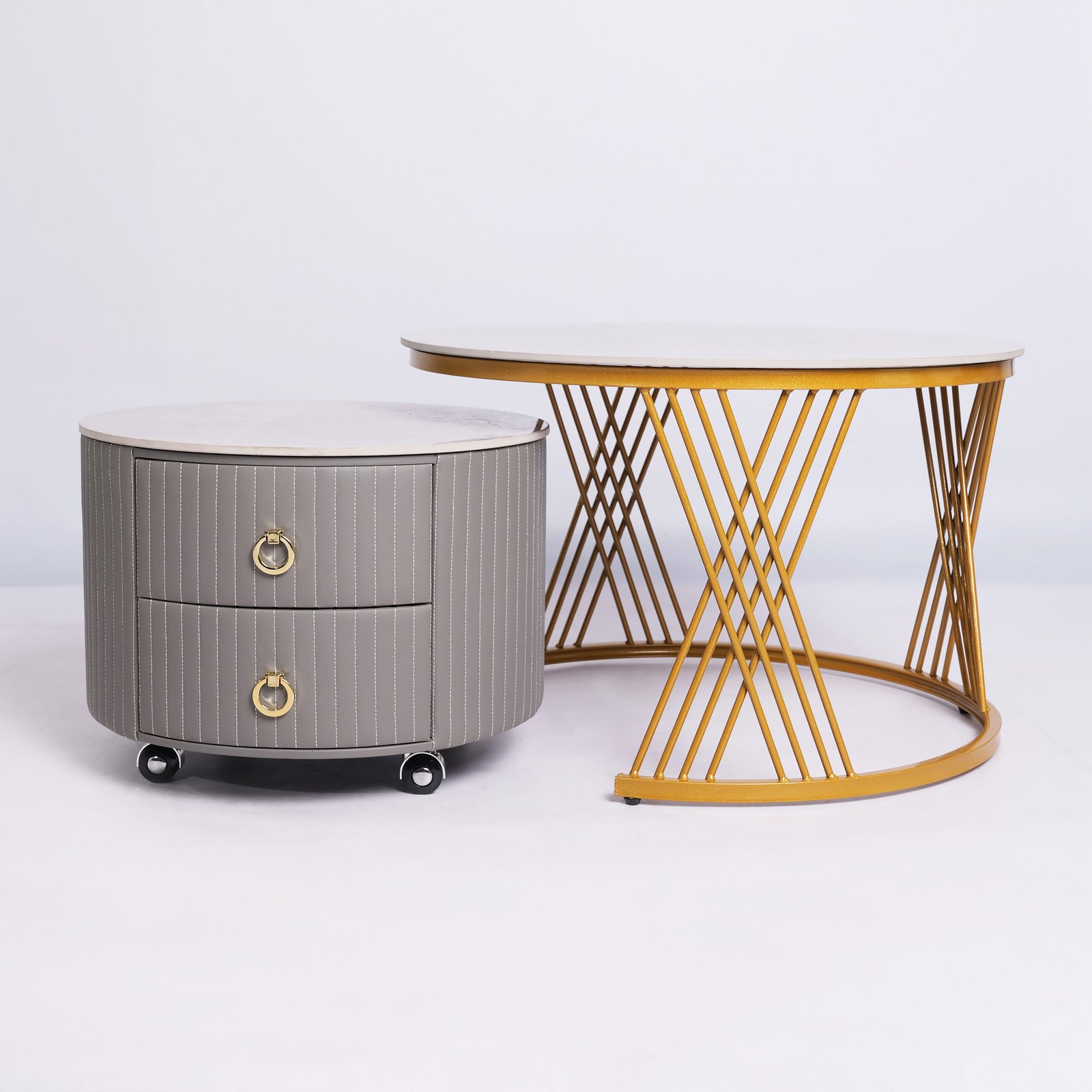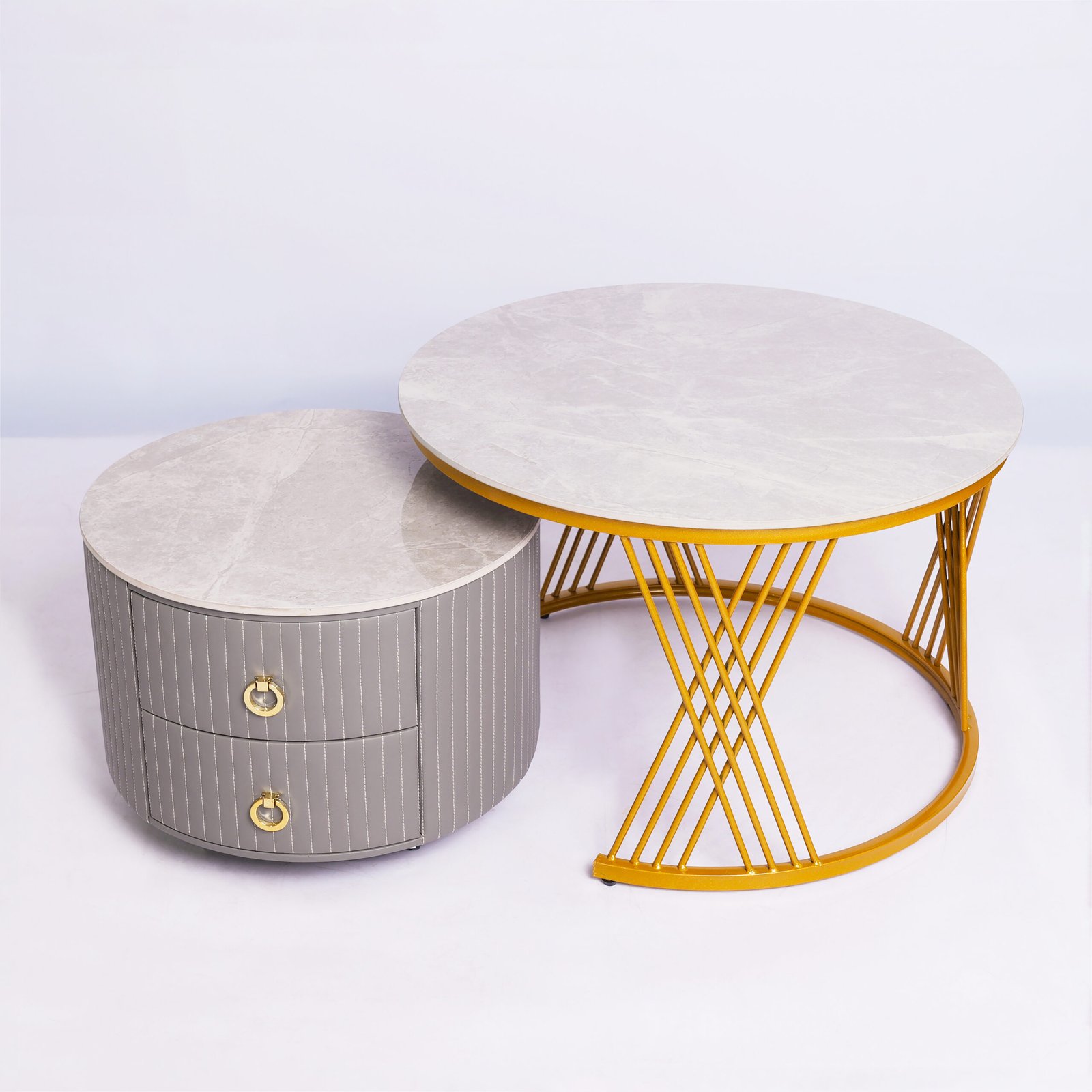 Menggabungkan fungsionalitas dan kemewahan, meja ini terdiri dari satu meja utama yang tinggi dengan rangka emas (gold) yang menawan, serta satu meja pendamping yang dilengkapi dengan dua laci fungsional.