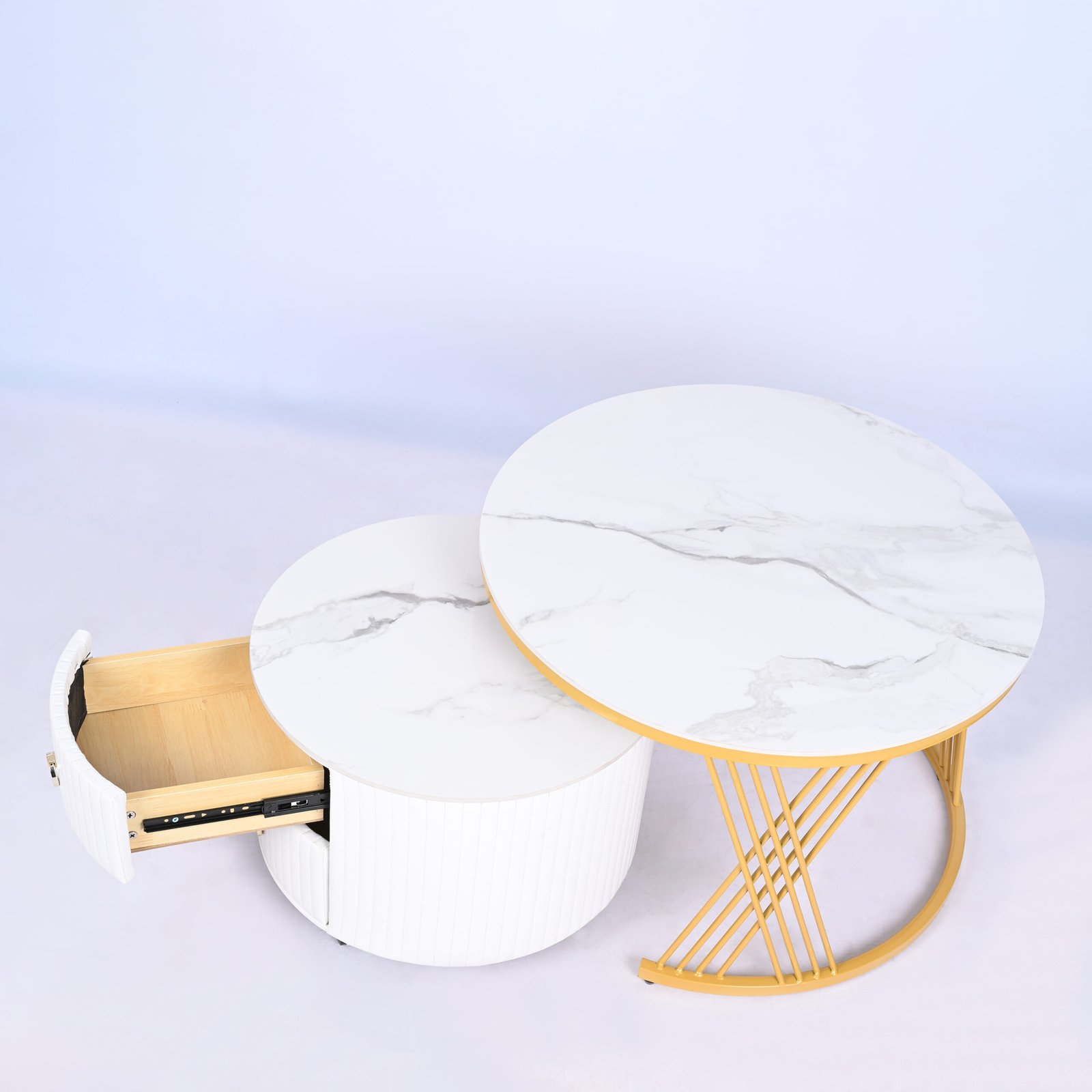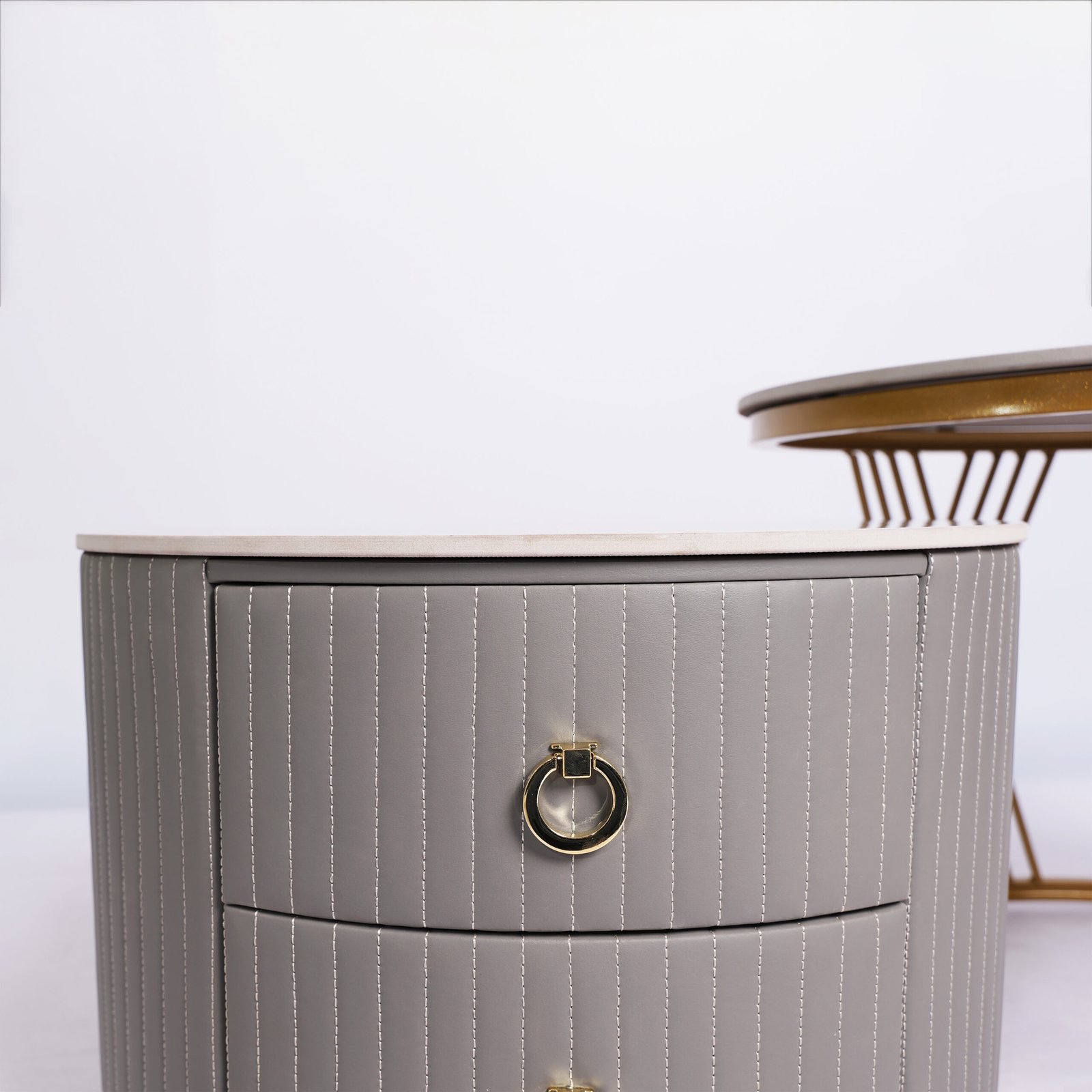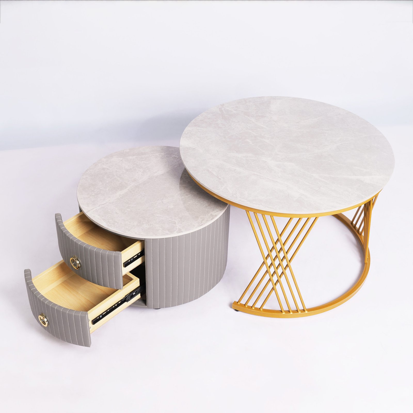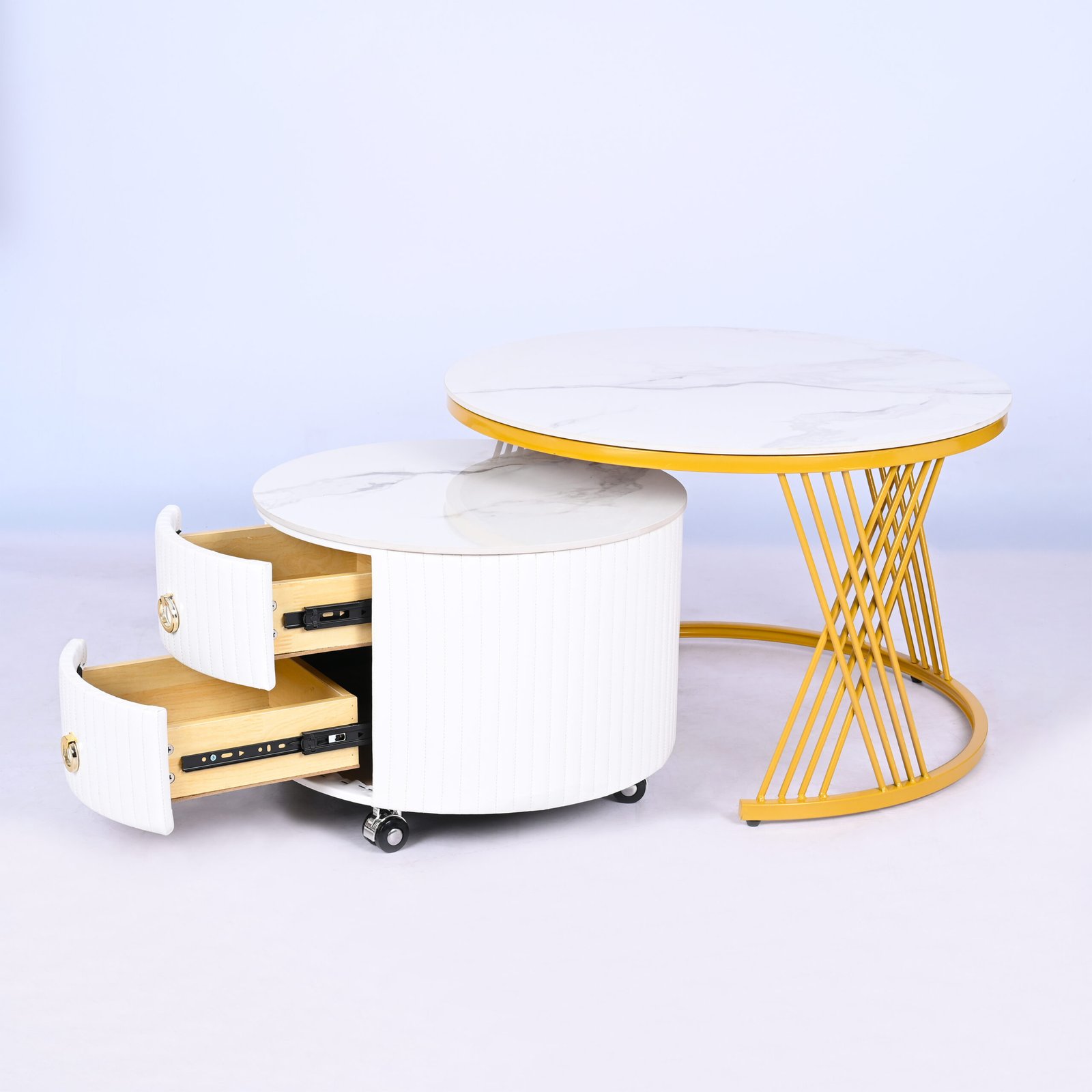 Menggabungkan fungsionalitas dan kemewahan, meja ini terdiri dari satu meja utama yang tinggi dengan rangka emas (gold) yang menawan, serta satu meja pendamping yang dilengkapi dengan dua laci fungsional.