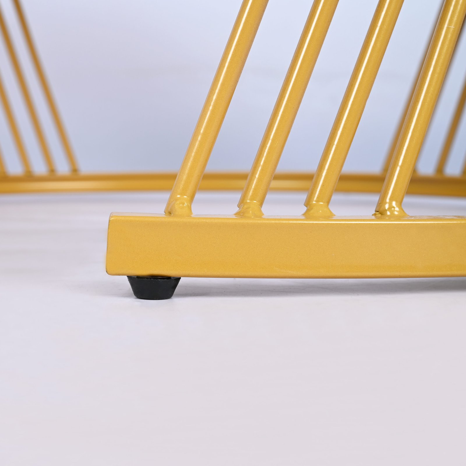 Rangka Artistik & Mewah: Meja utama ditopang oleh rangka besi bermotif garis melintang berwarna emas (gold finish) yang memberikan kesan visual ringan namun megah.