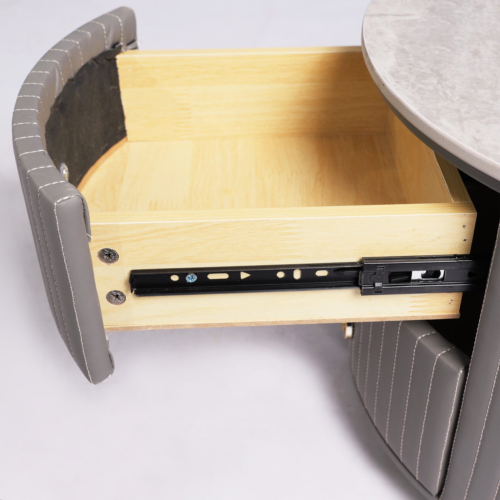 Ruang Penyimpanan Tersembunyi: Meja kecil dilengkapi dengan 2 laci tarik yang elegan, cocok untuk menyimpan remote TV, majalah, atau aksesoris ruang tamu agar meja tetap terlihat rapi (clutter-free).