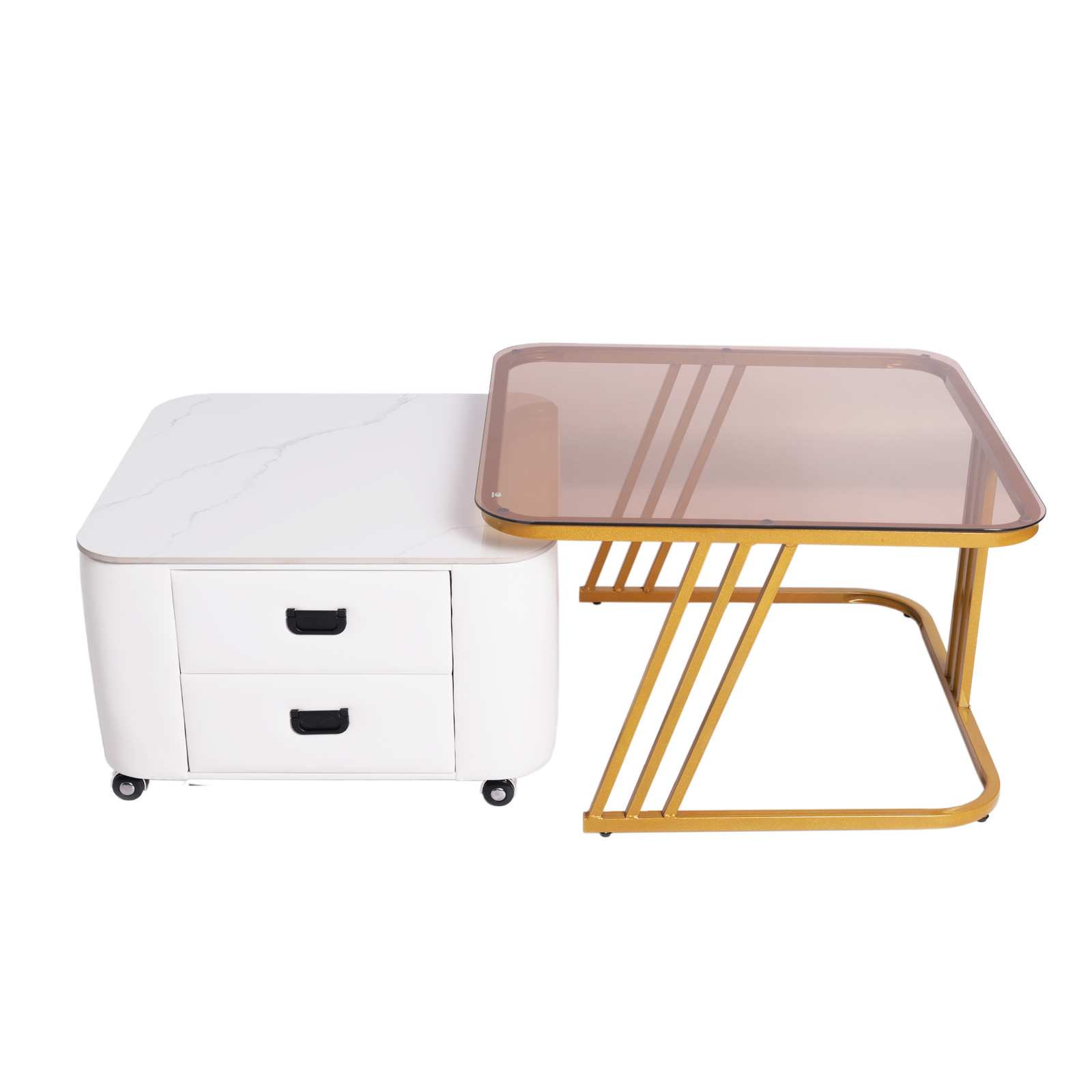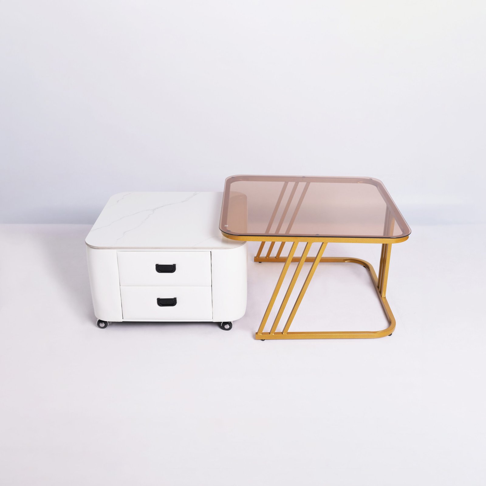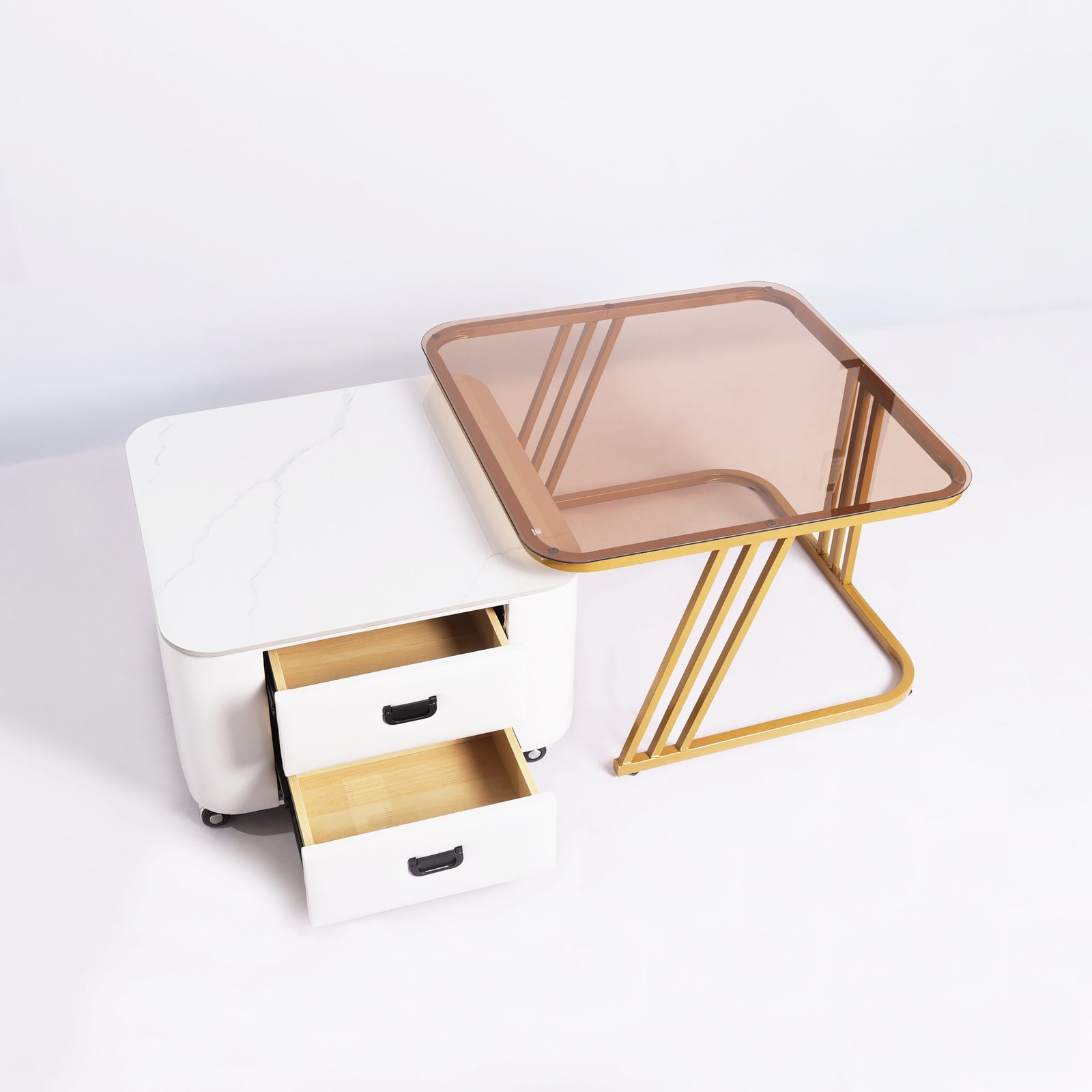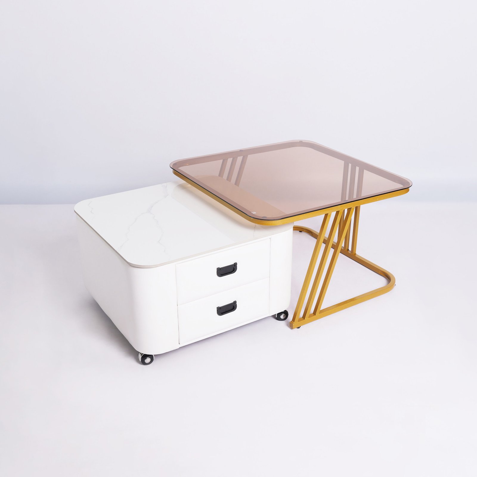 Desain Nesting Cerdas: Mengoptimalkan penggunaan ruang. Meja pendamping dapat disimpan di bawah meja utama saat tidak digunakan.
