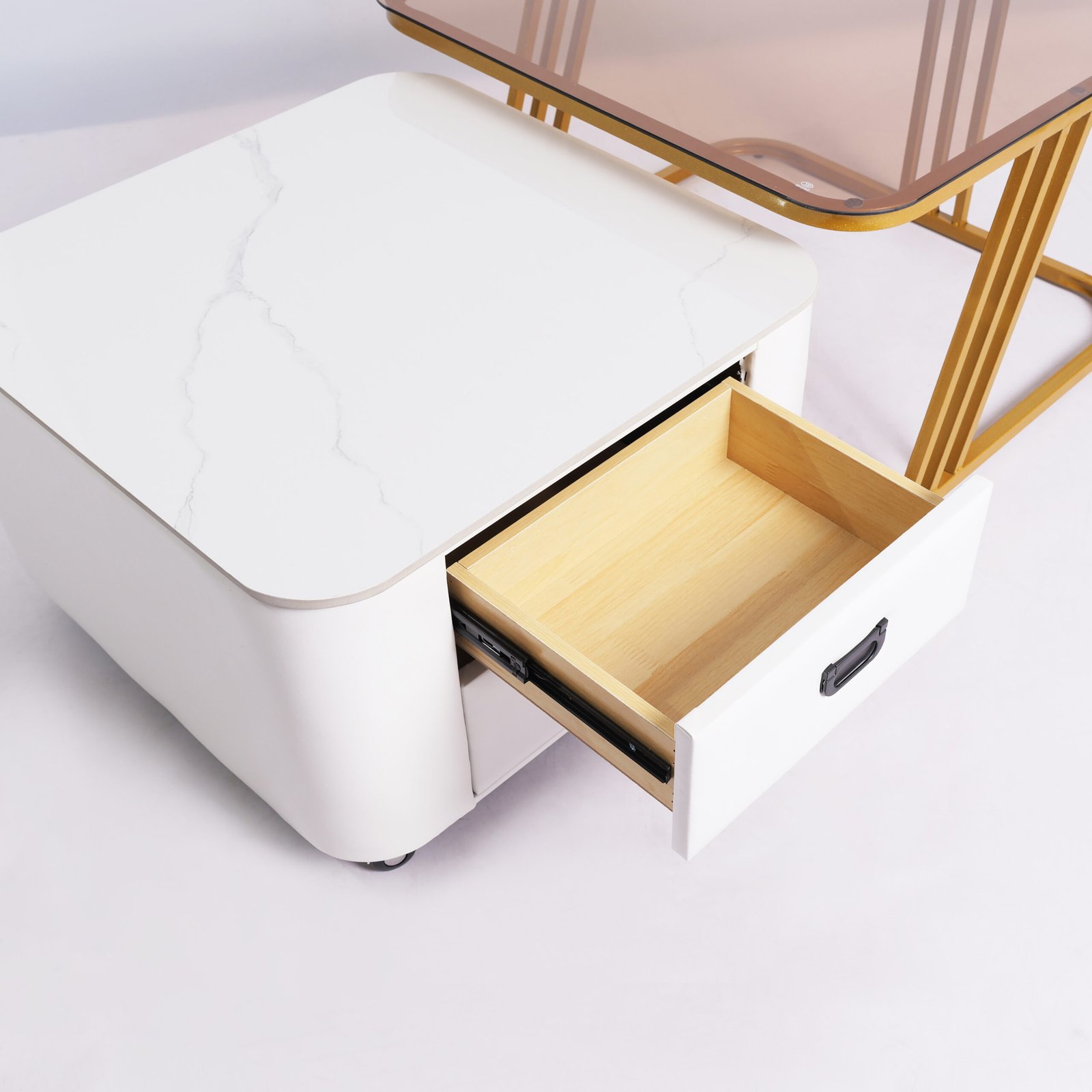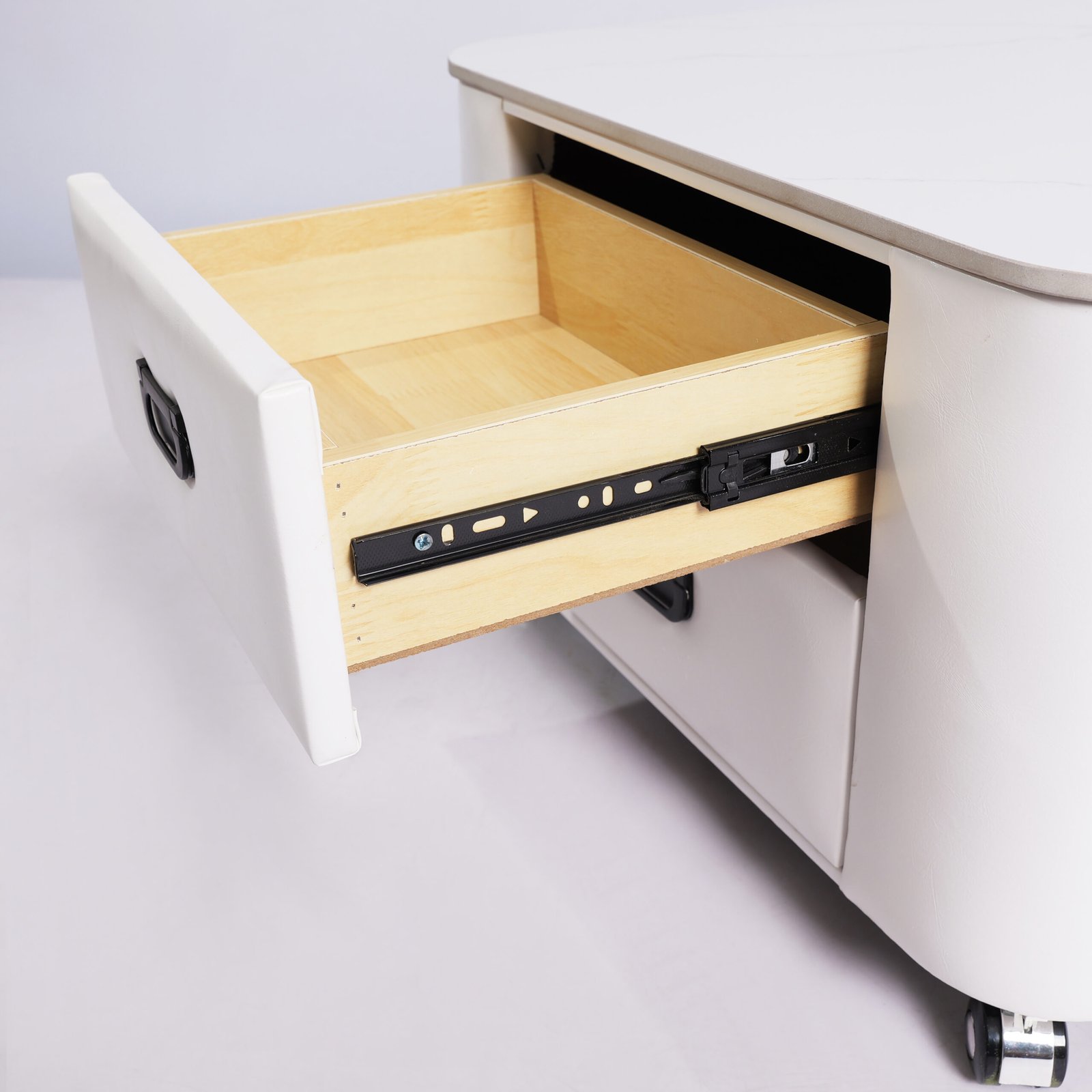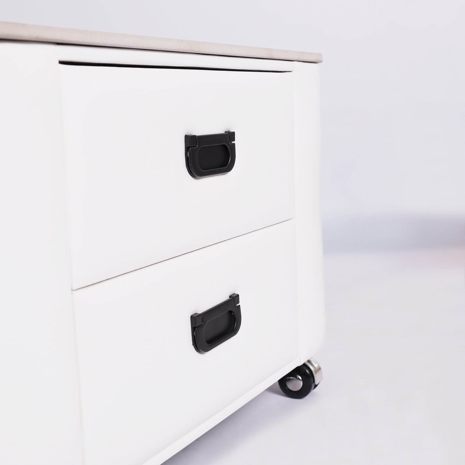 Keunikan seri ini terletak pada meja pendampingnya yang dilengkapi dengan roda ( casters ), memudahkan Anda untuk menarik atau menggeser meja laci tanpa tenaga ekstra.