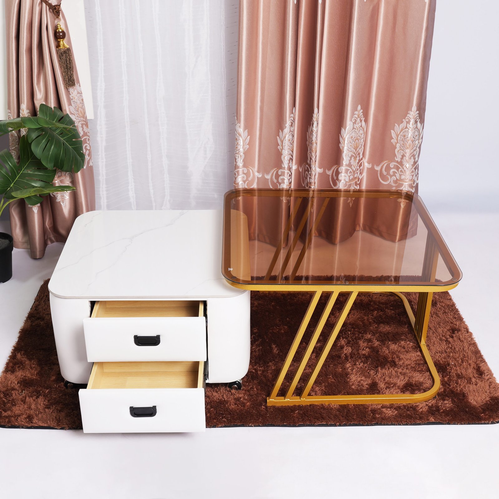 Dual-Material Luxury: Kombinasi top table kaca tempered setebal 5 mm yang tahan panas/benturan dan marmer putih setebal 1 cm yang mewah.
