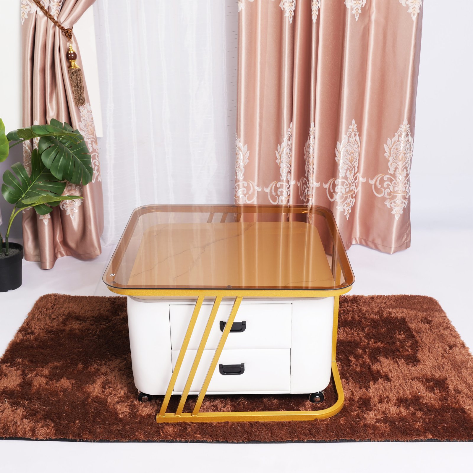 Perpaduan rangka emas (gold finish) dan material kaca memberikan kesan ruangan yang lebih lapang dan elegan.