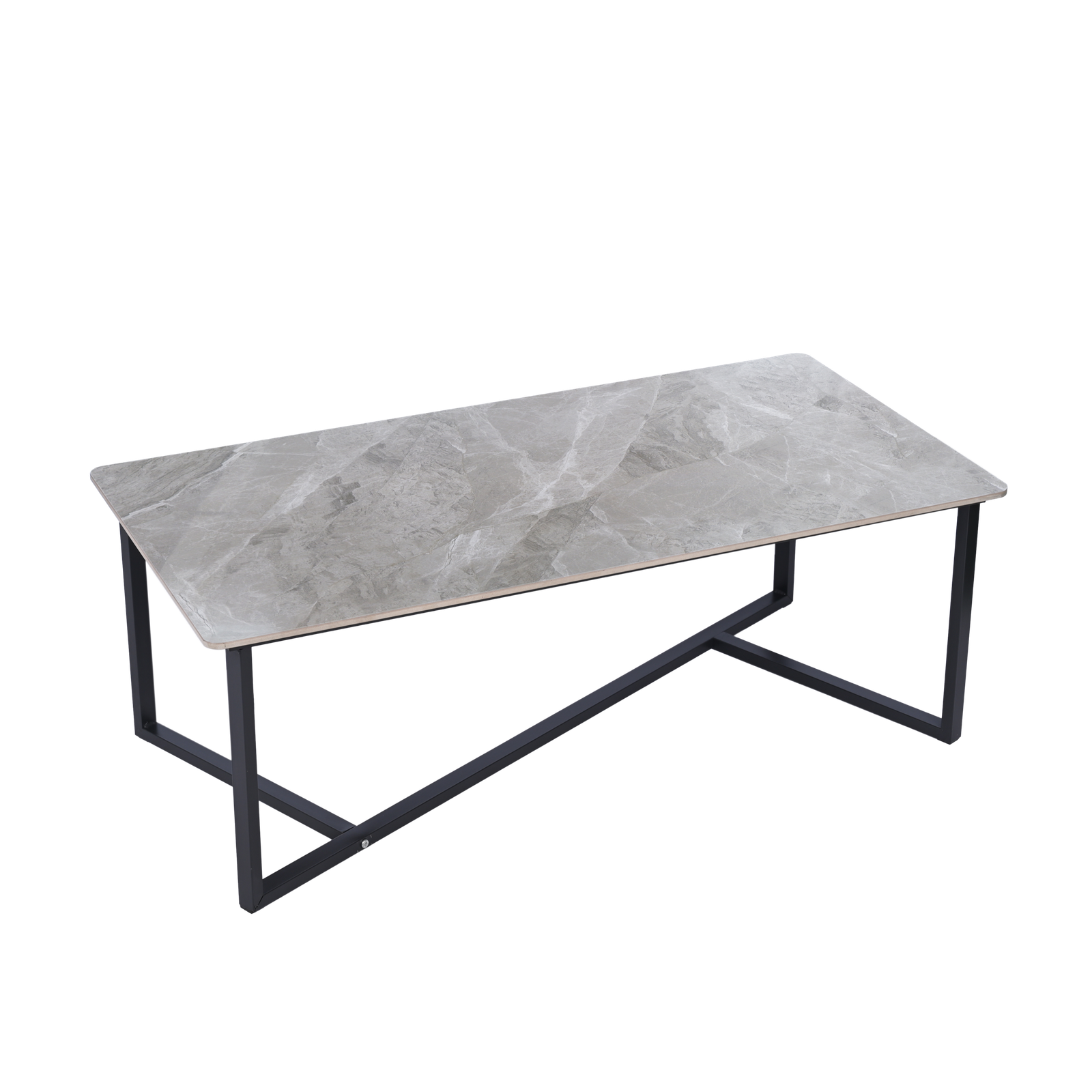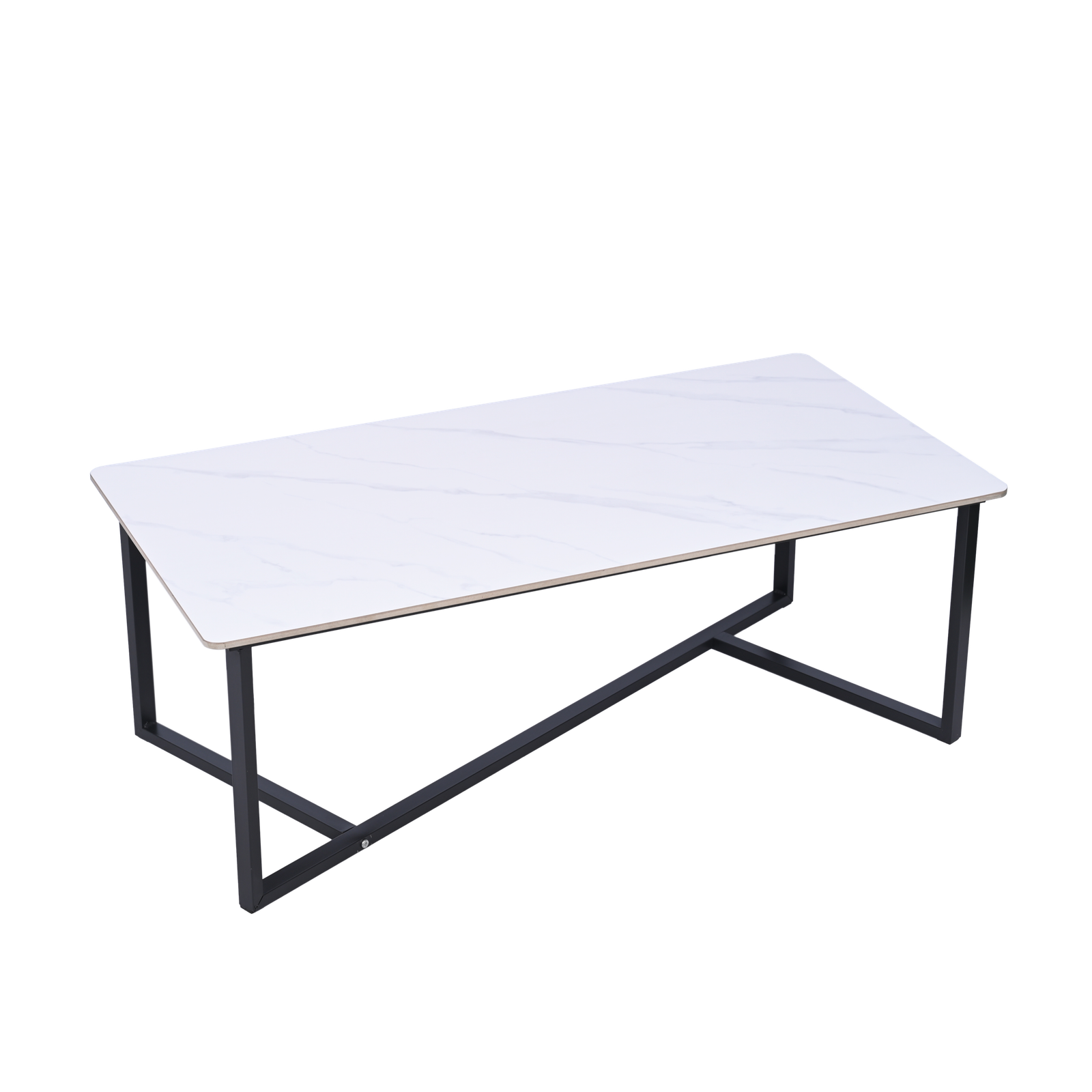 Perpaduan antara permukaan meja bermotif marmer yang elegan dan rangka kaki asimetris berwarna hitam matte memberikan kesan visual yang unik, ringan, namun tetap kokoh.