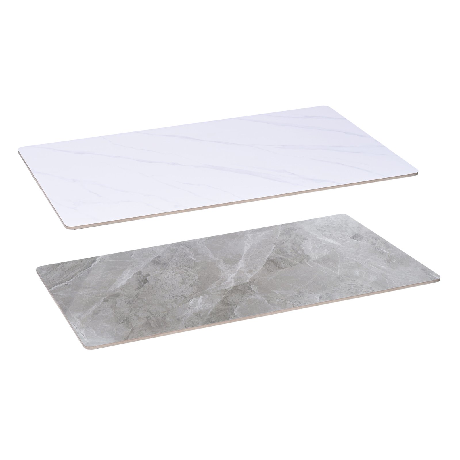 Abu: Permukaan motif marmer abu-abu elegan dengan rangka hitam (Cocok untuk nuansa ruangan yang lebih hangat atau industrial).